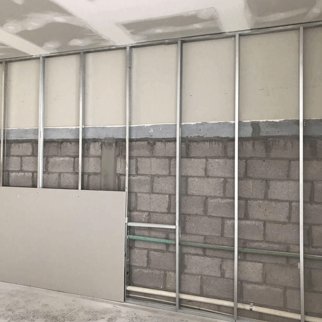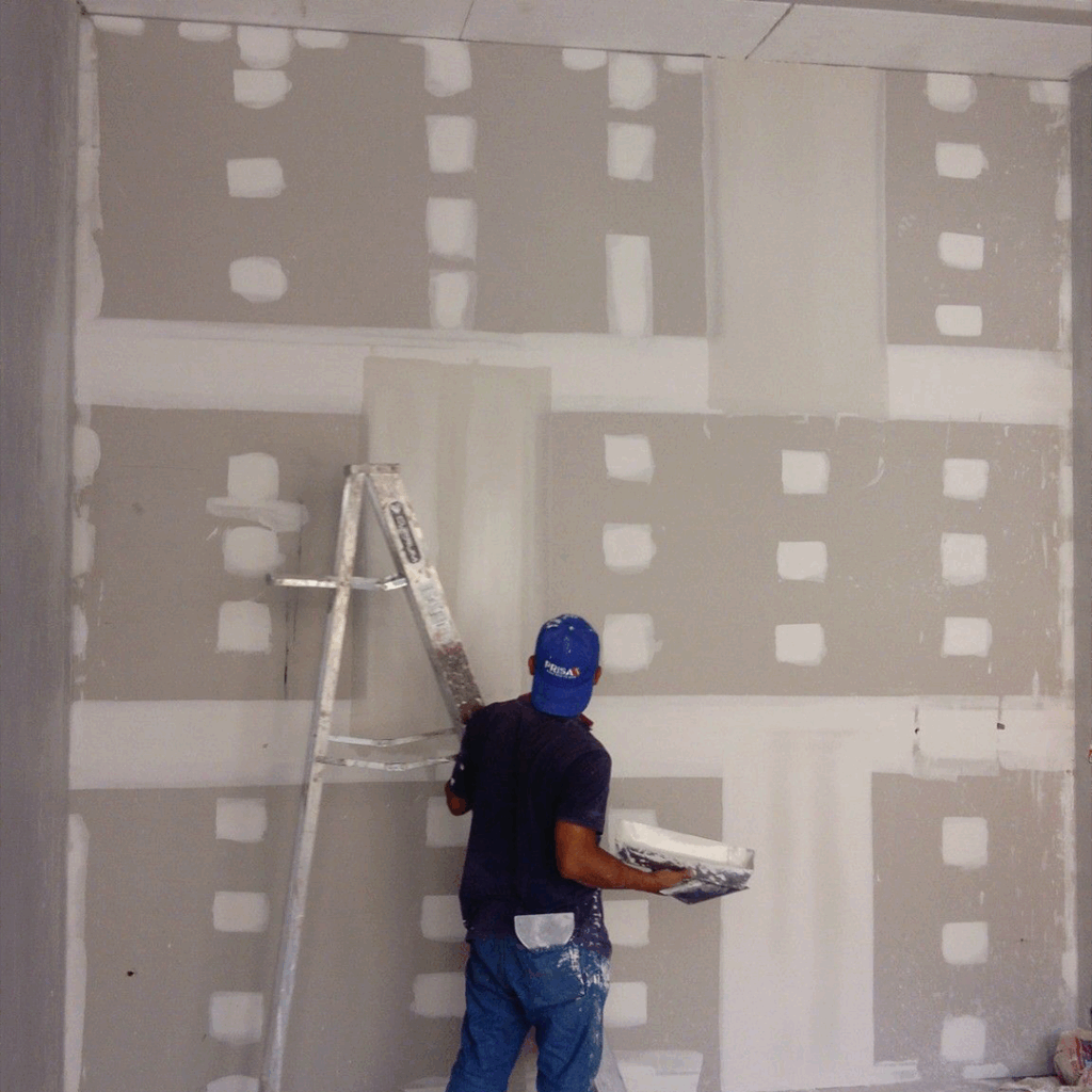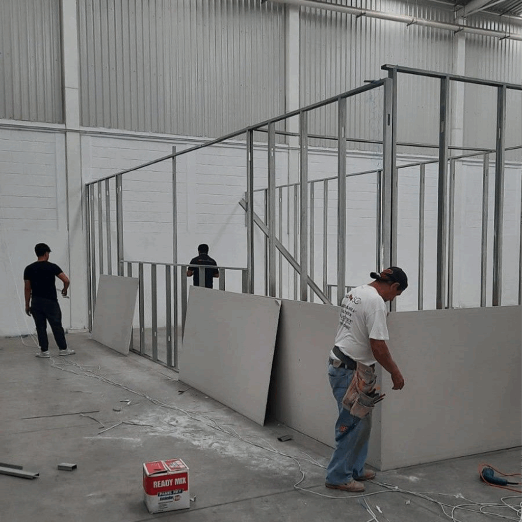 Proceso: Colocación de estructura metálica, fijación de paneles, tratamiento de juntas y aplicación de acabado final (pasta y pintura).