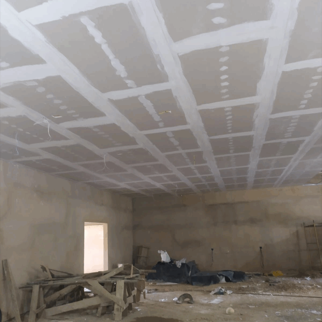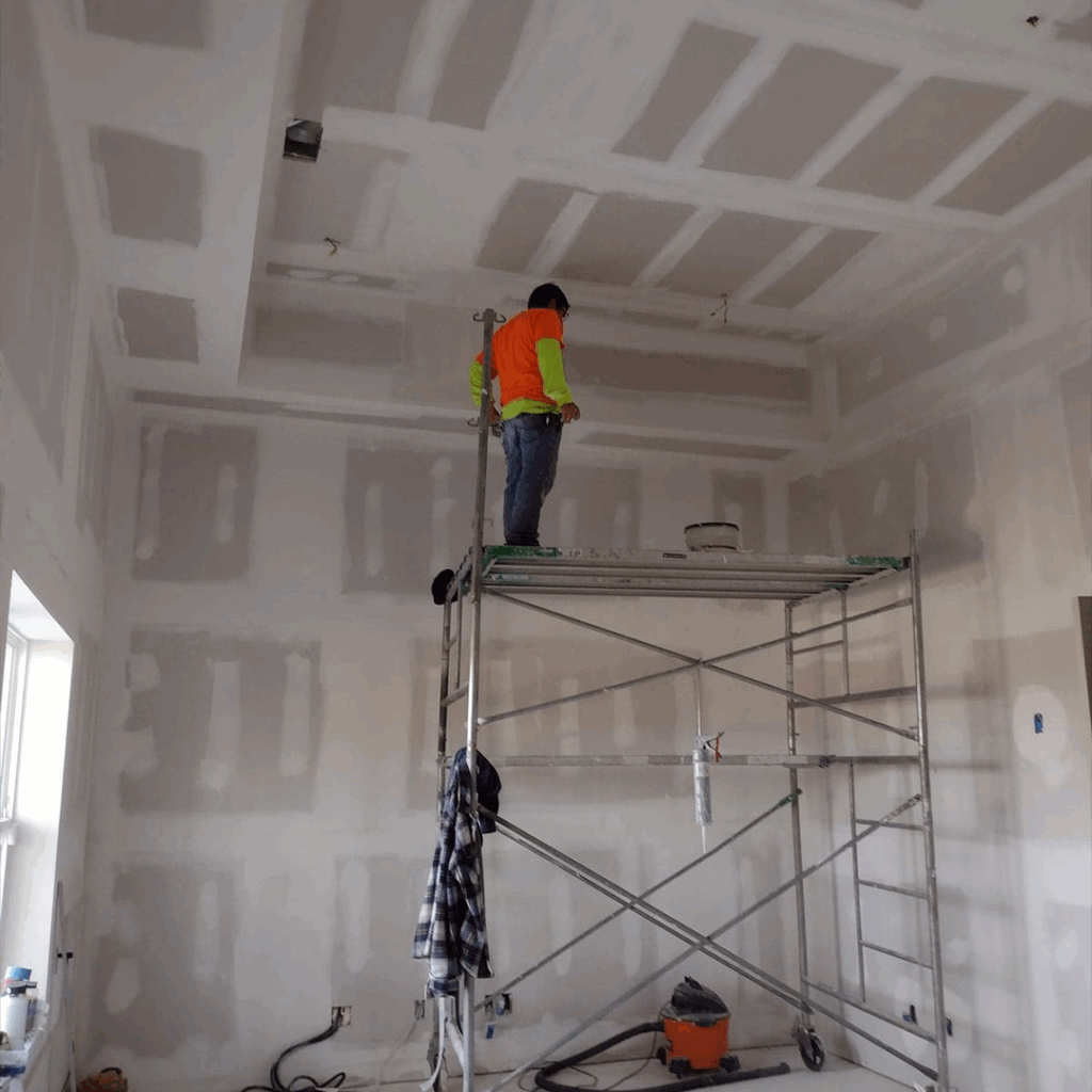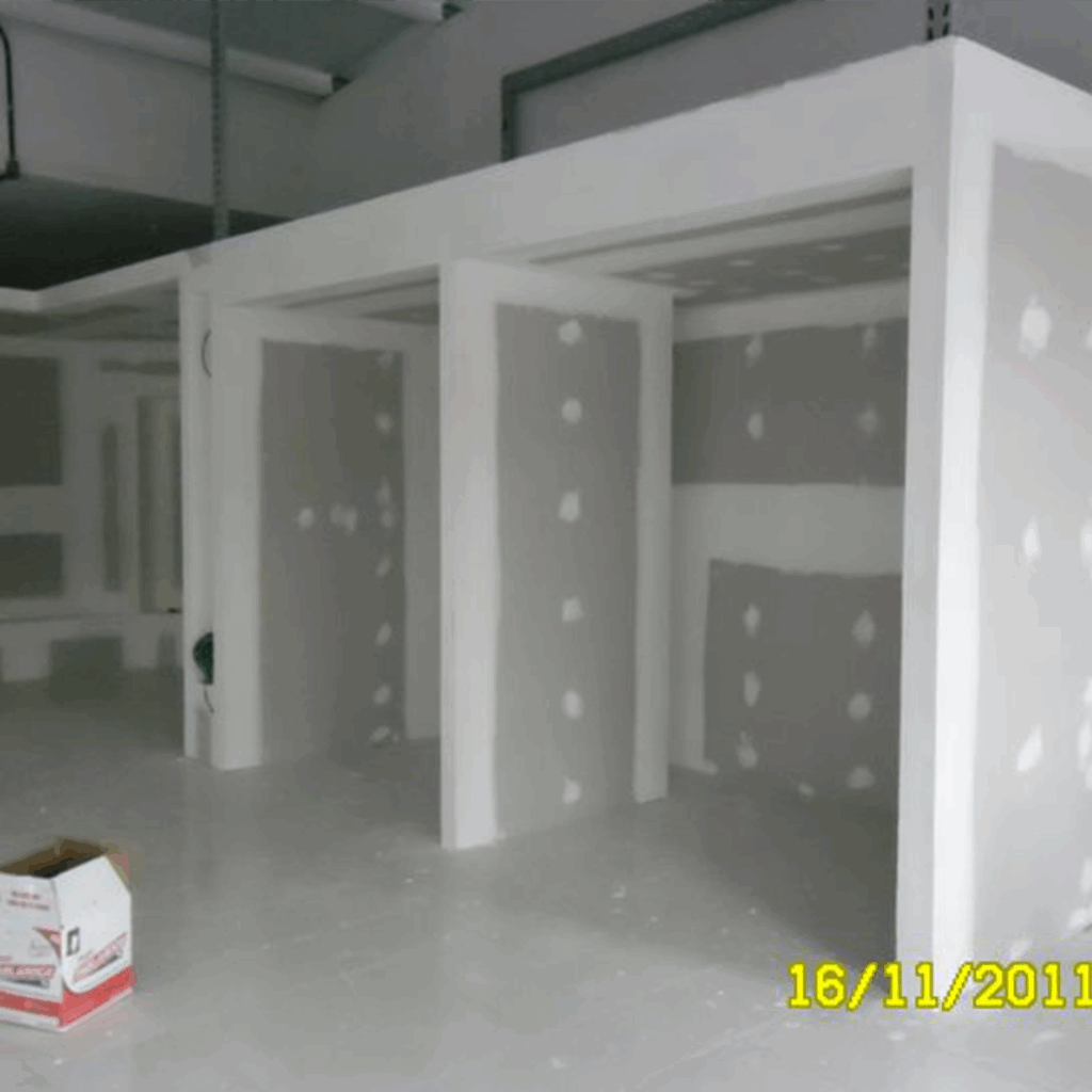 Proceso: Colocación de estructura metálica, fijación de paneles, tratamiento de juntas y aplicación de acabado final (pasta y pintura).