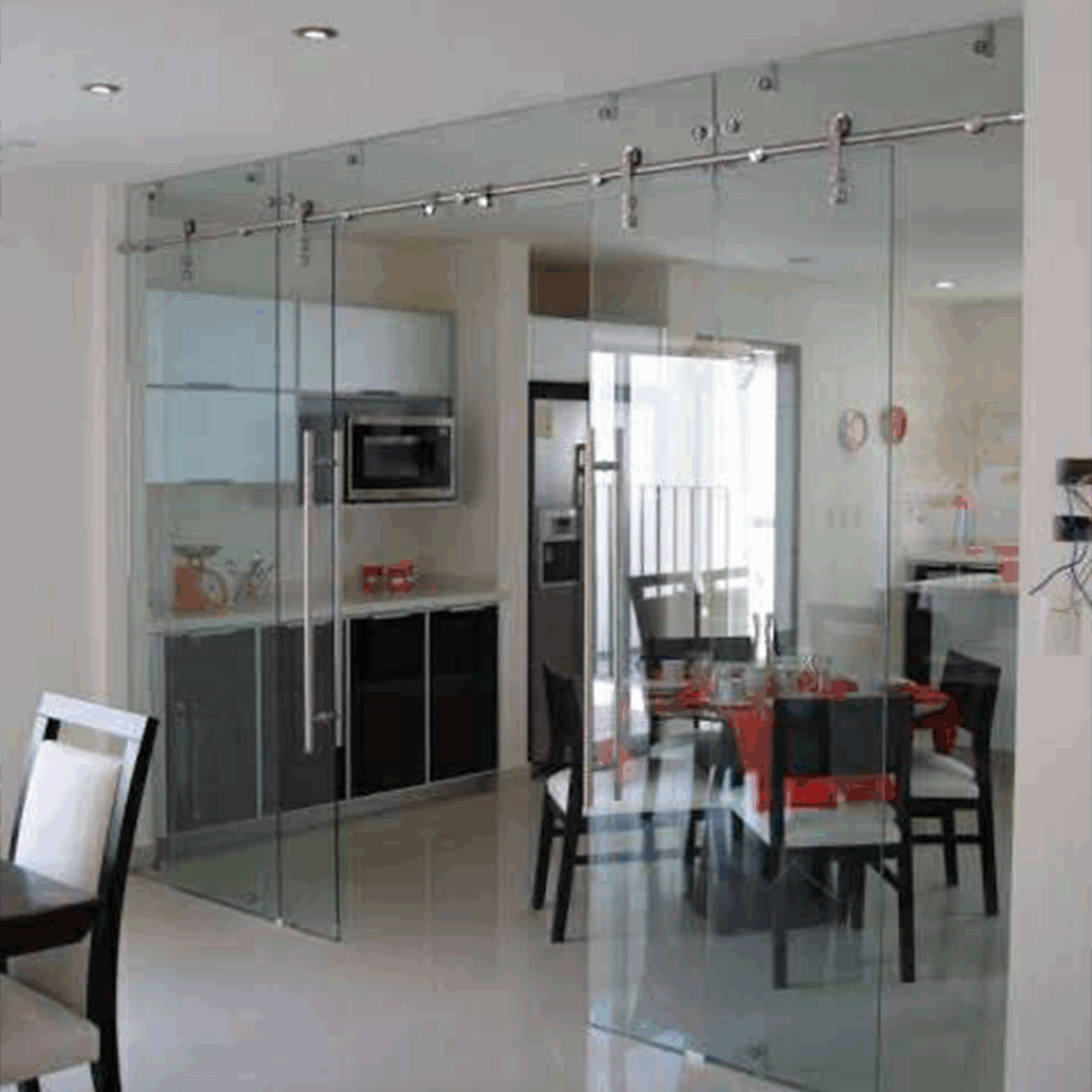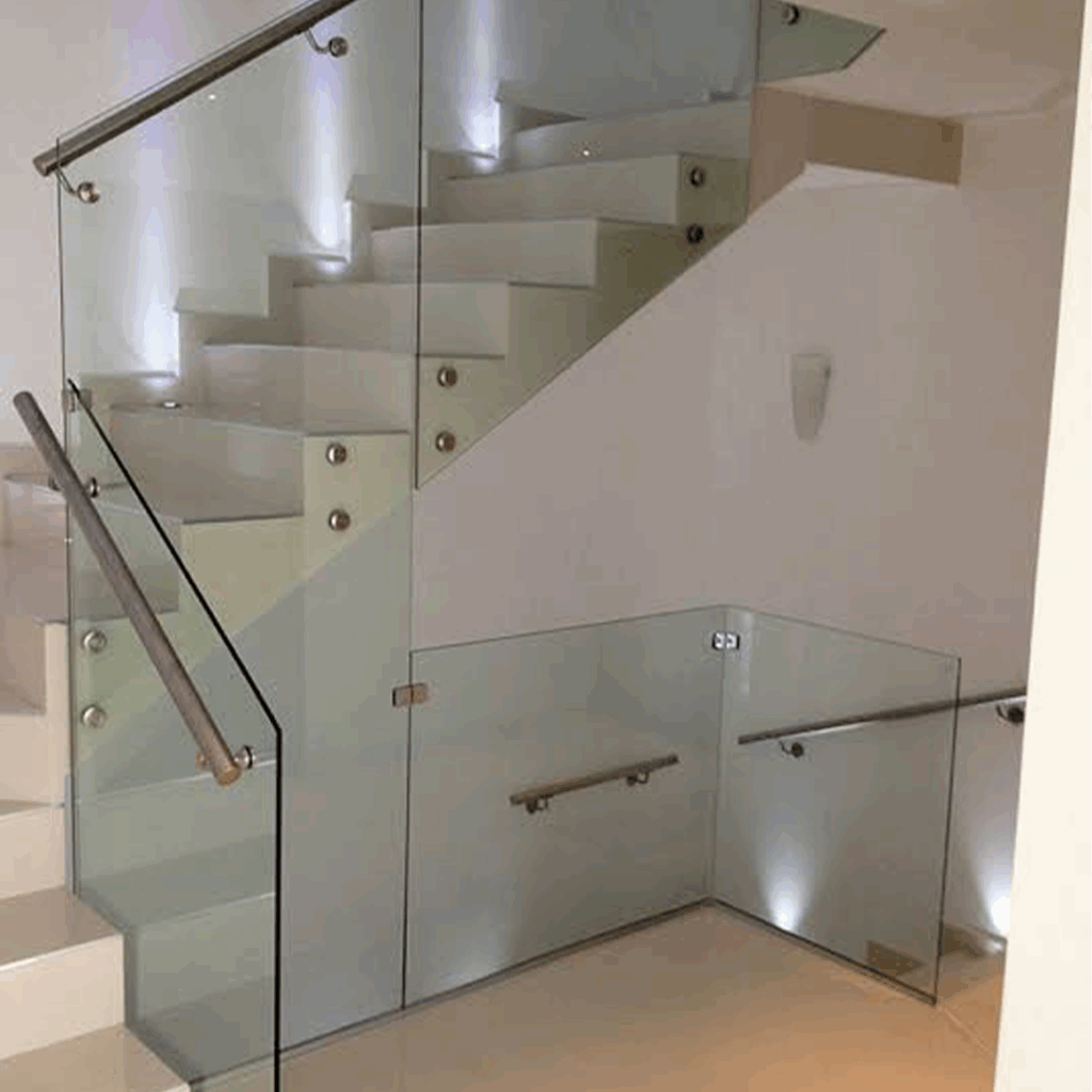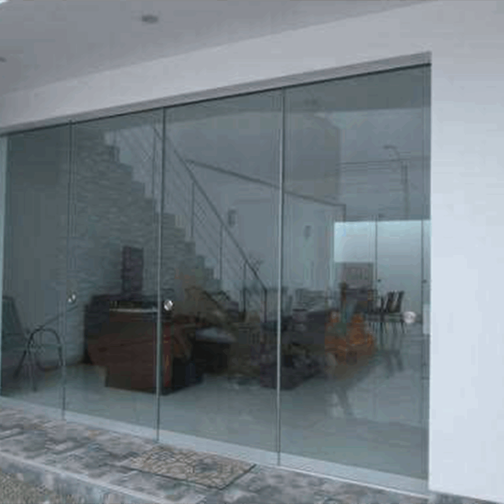 Proceso: Corte del vidrio según diseño, templado en horno y montaje con herrajes especializados.