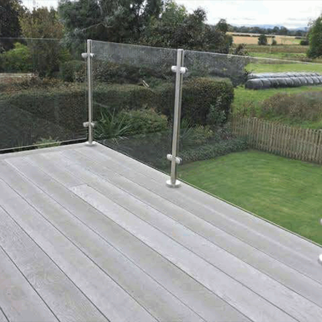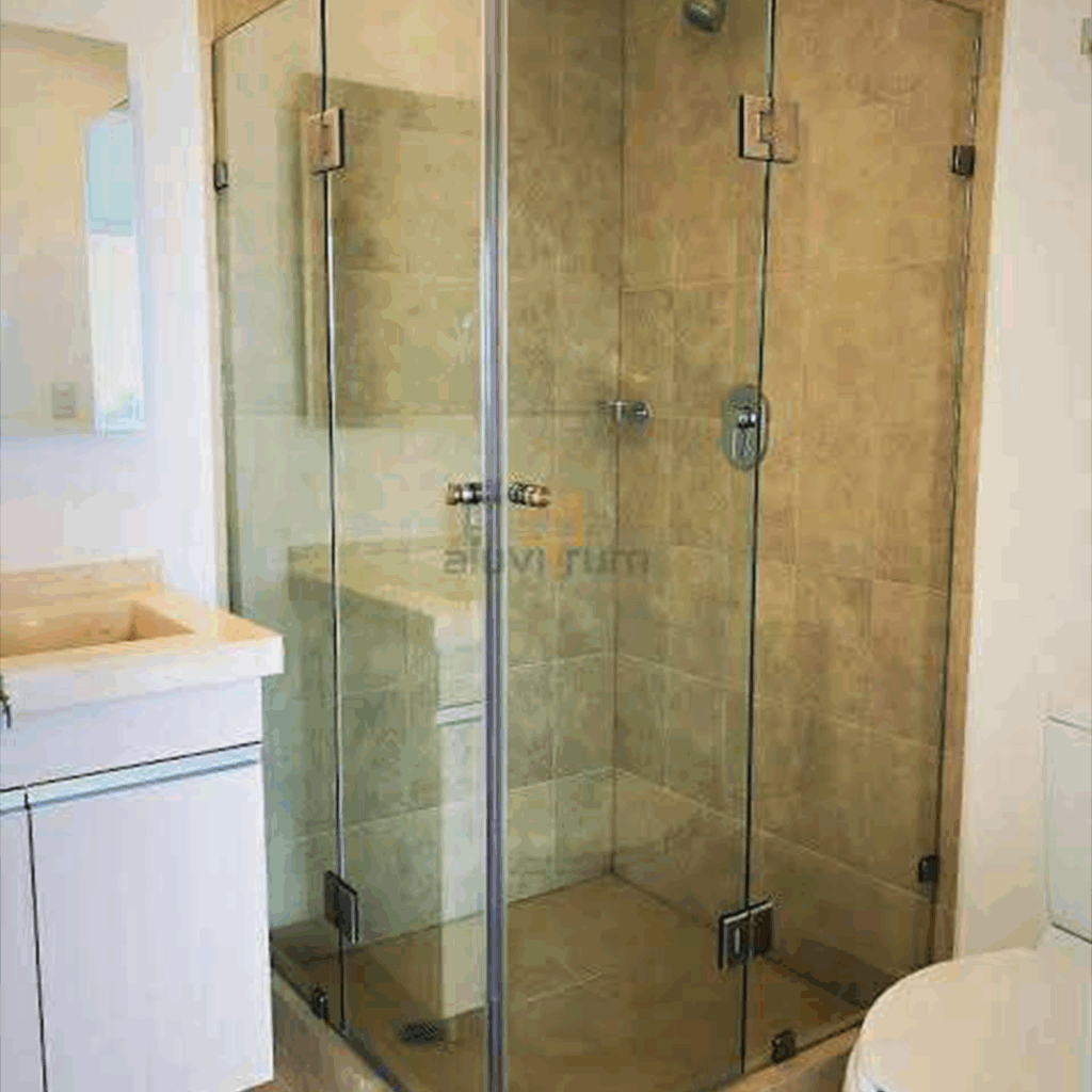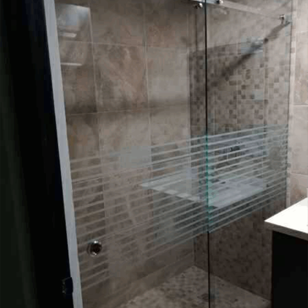 Proceso: Corte del vidrio según diseño, templado en horno y montaje con herrajes especializados.